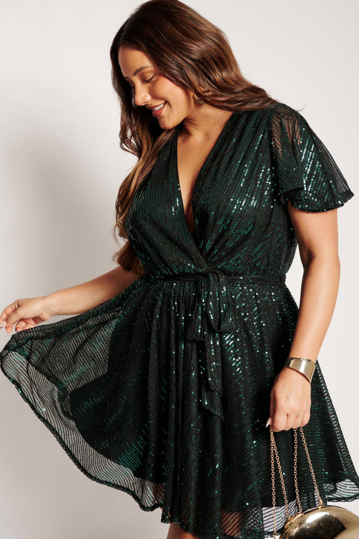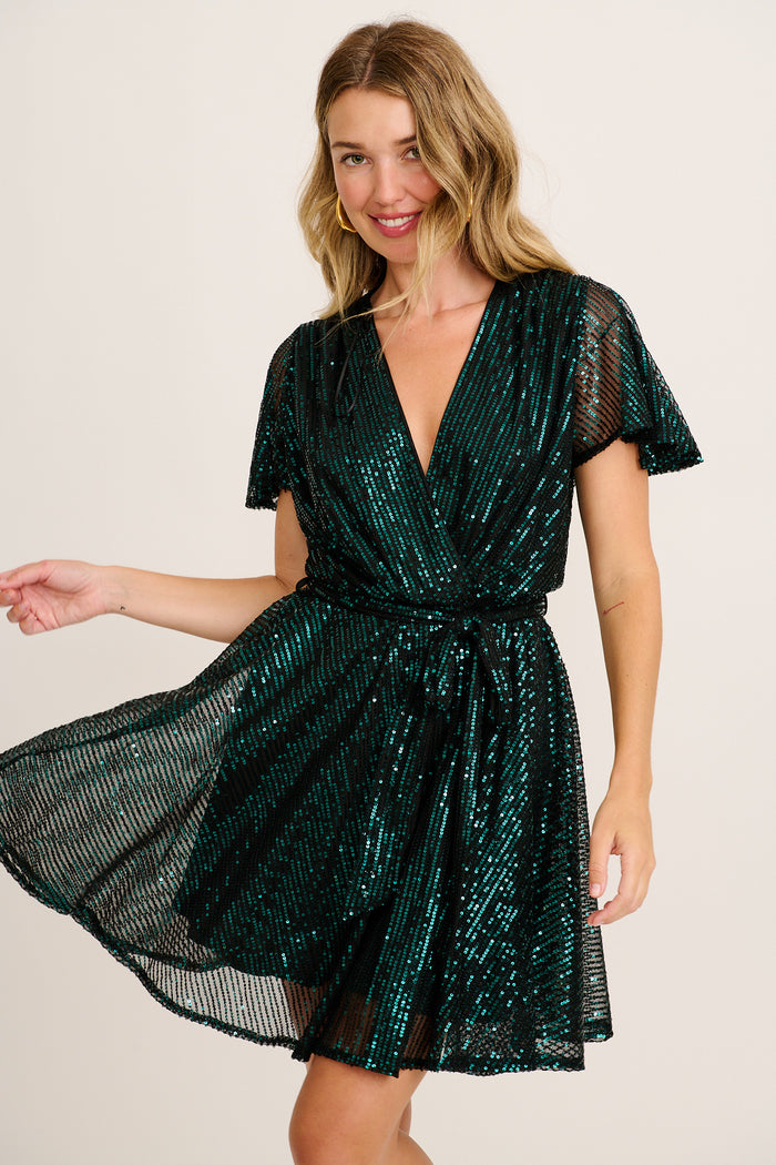 Made from stretch, wash and wear sequin fabric, this mini dress is both comfortable and eye-catching. The mock V neck wrap flatters your neckline, while a soft elastic waist and separate belt provide a cinched silhouette. Flutter sleeves offer easy movement and a soft, floaty finish.