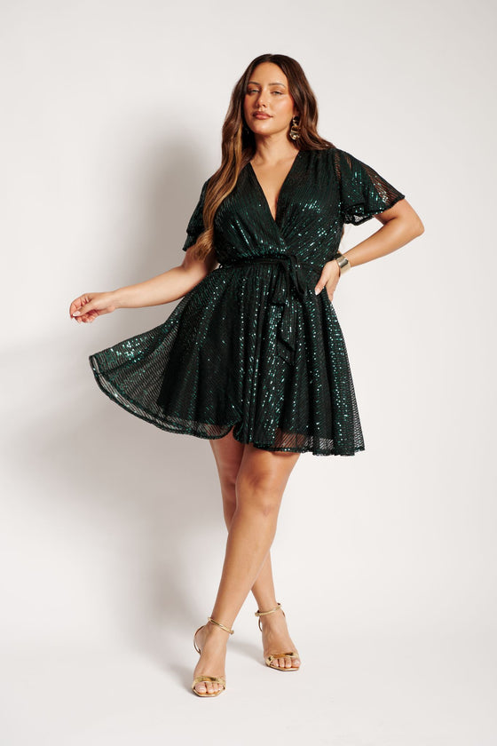 Shine bright in the Amoretto Dress in Emerald Sequin — a festive favourite made for glimmering entrances and unforgettable nights. With its rich green hue and soft sparkle, this dress is the definition of party-ready glamour.