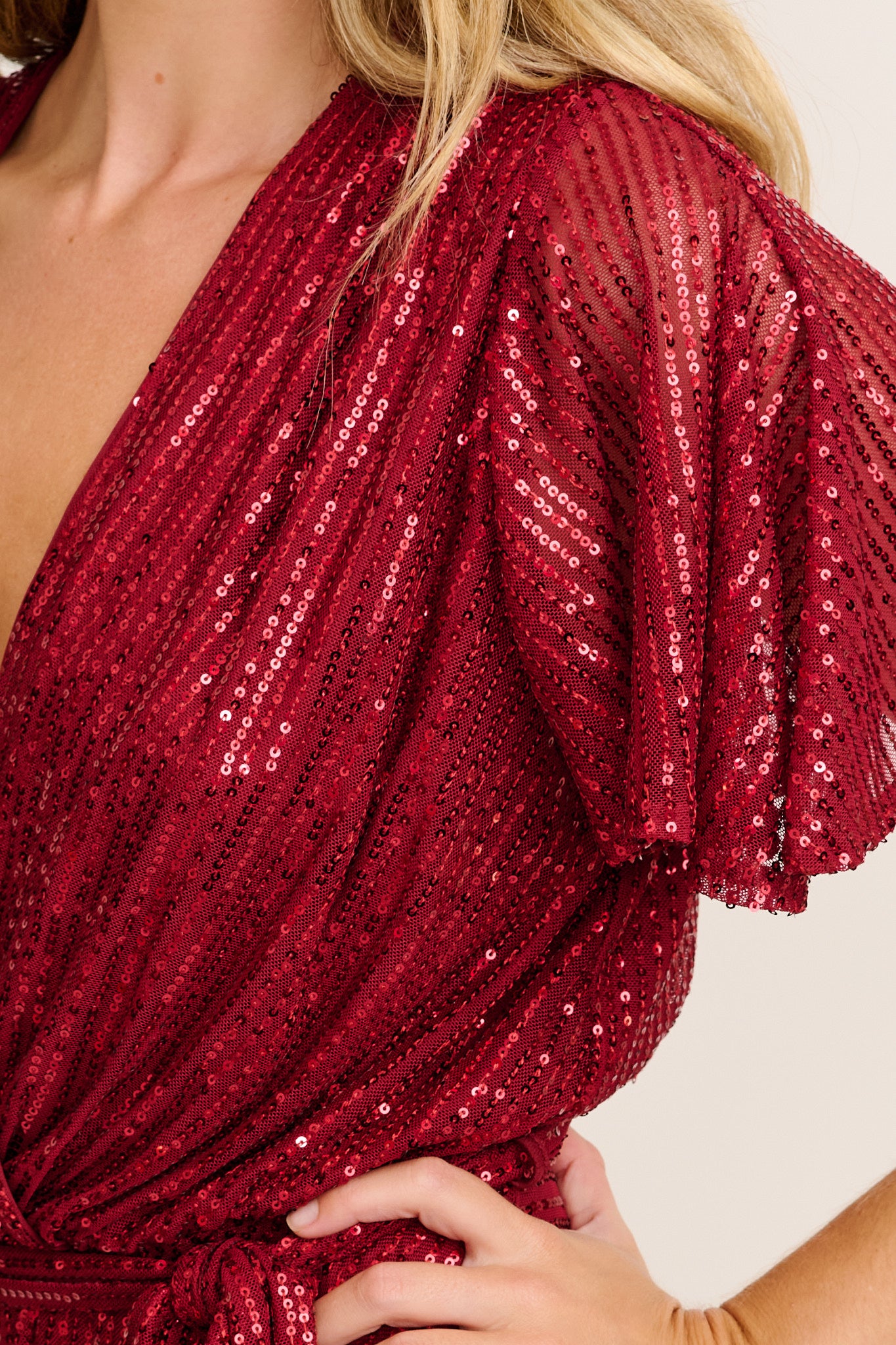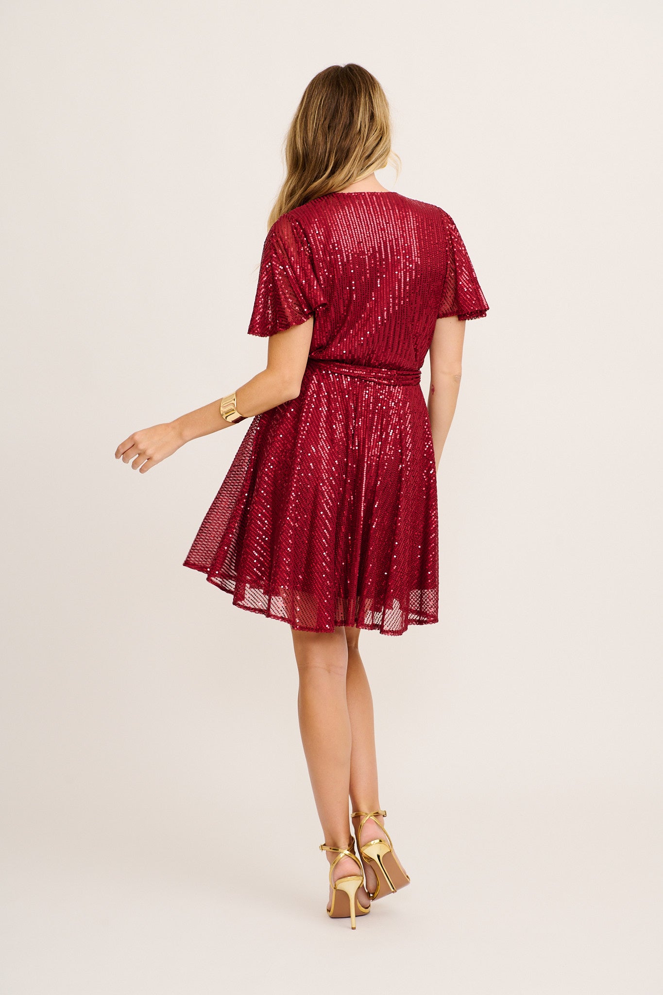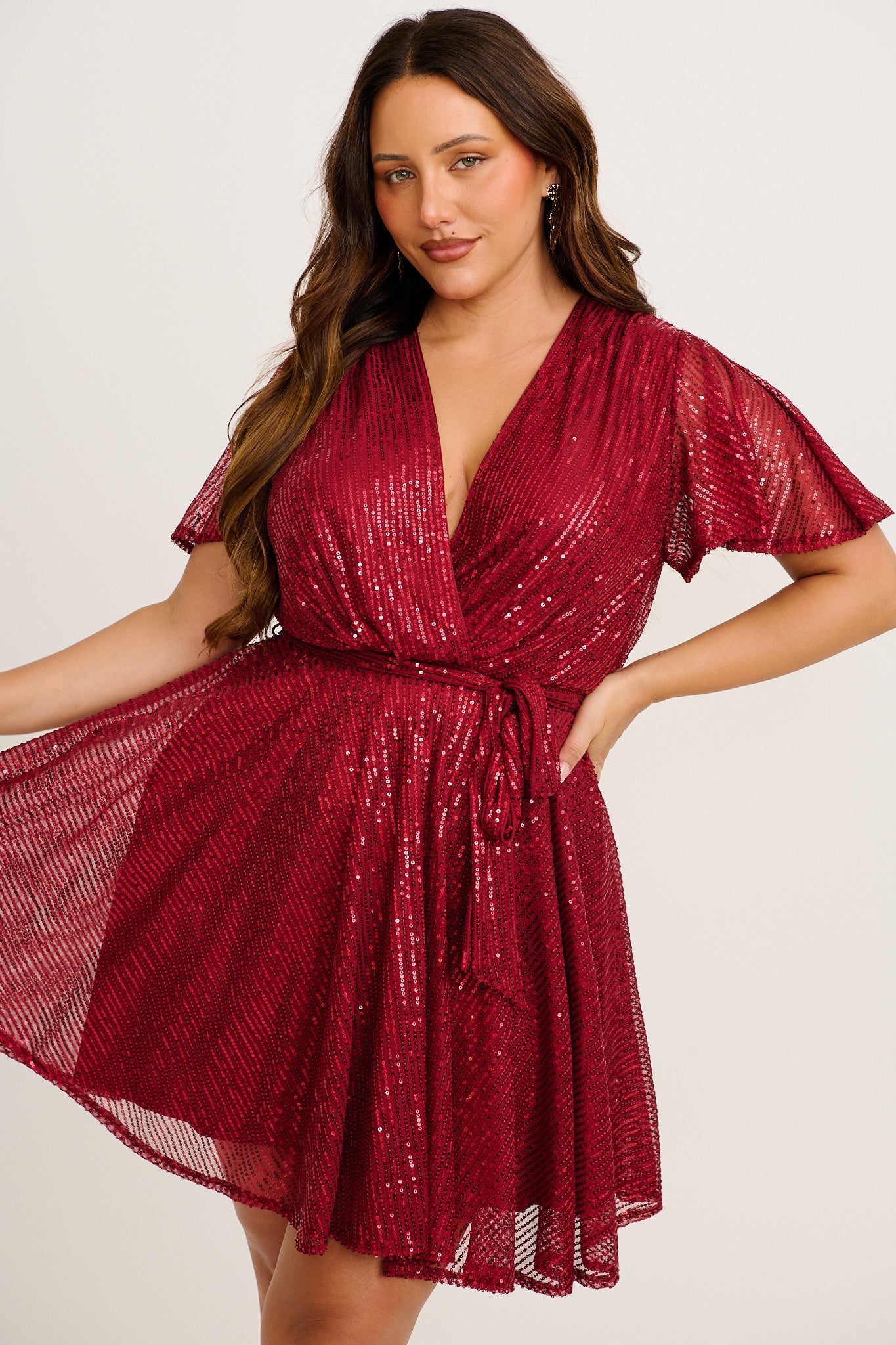 Crafted from a stretch, wash and wear sequin fabric, this mini dress features a mock V neck wrap front that flatters the bust, while a soft elastic waist ensures all-day comfort. The separate waist tie cinches your shape and adds definition, and flutter sleeves offer movement and coverage with ease.