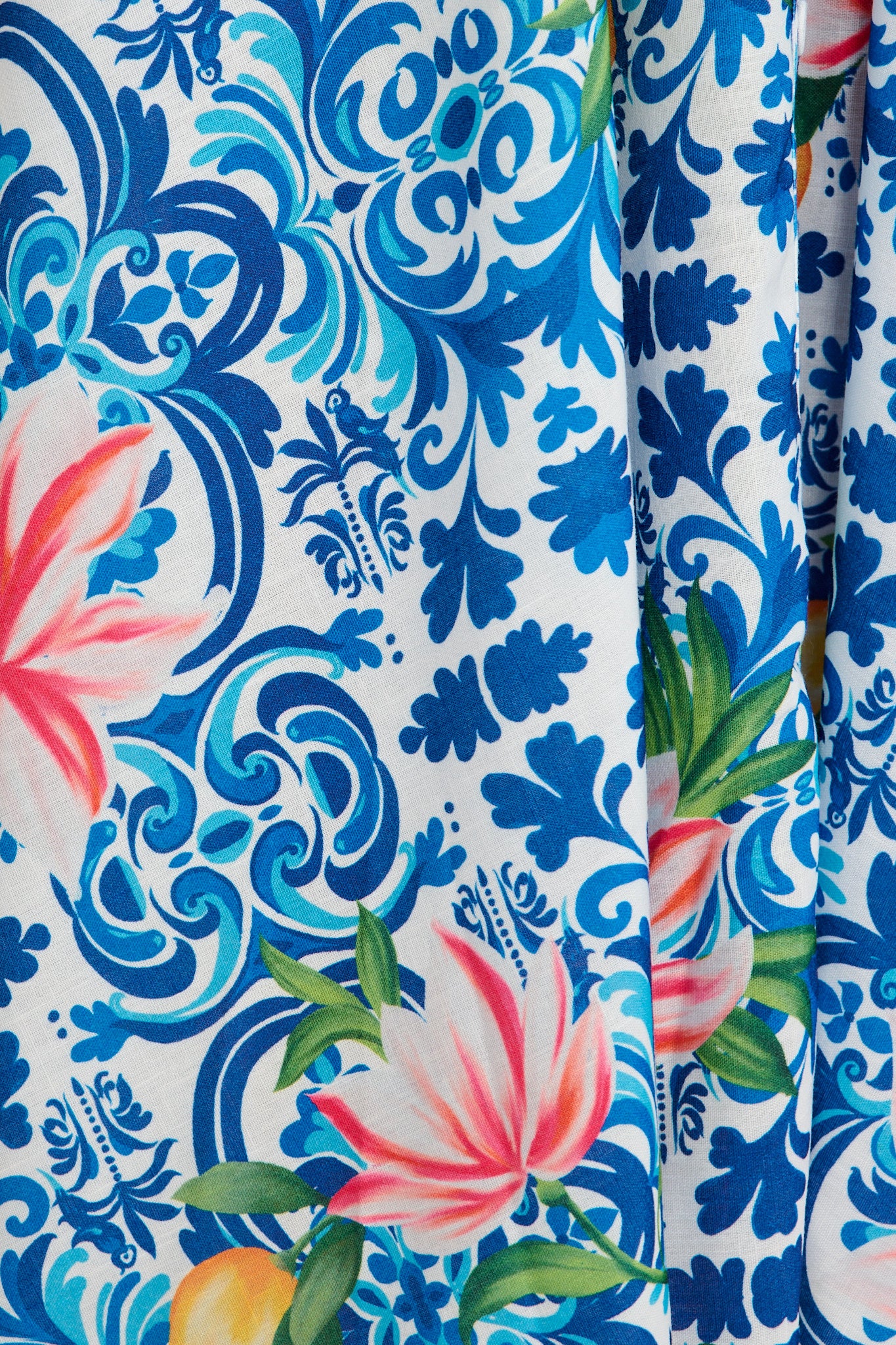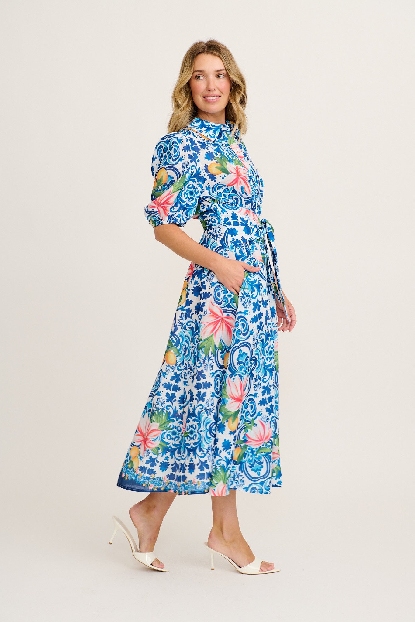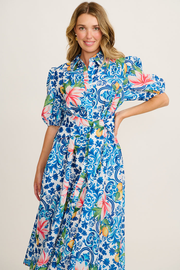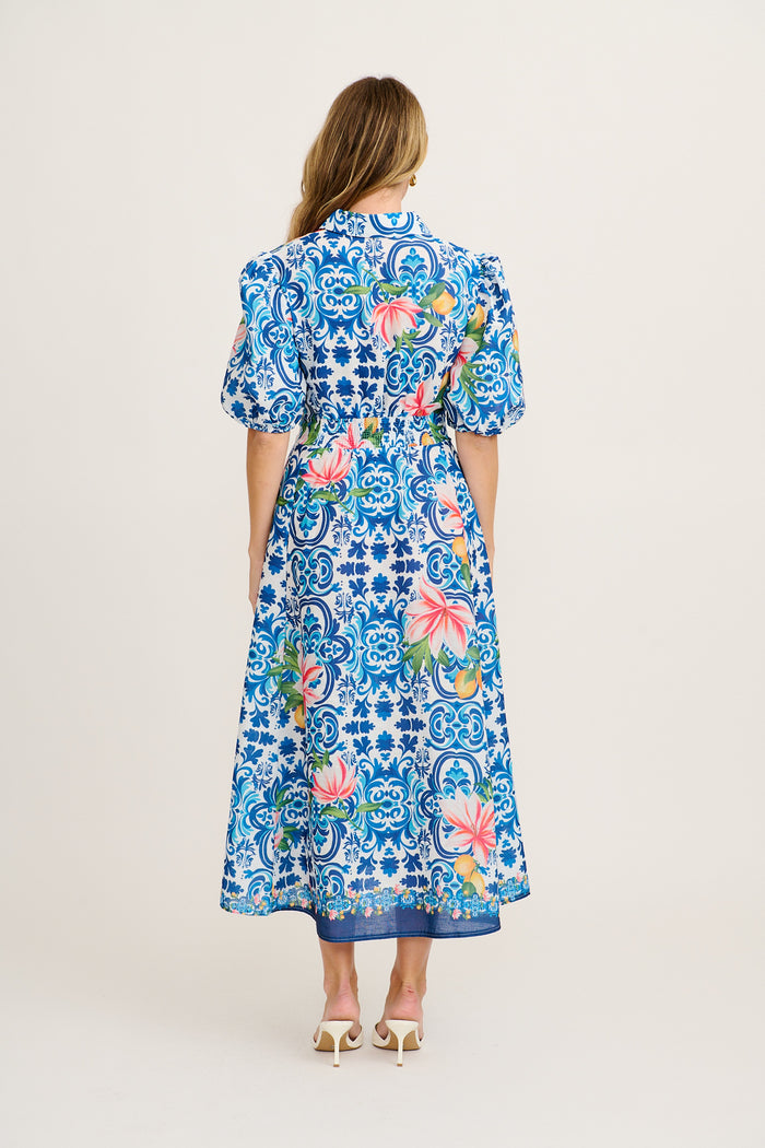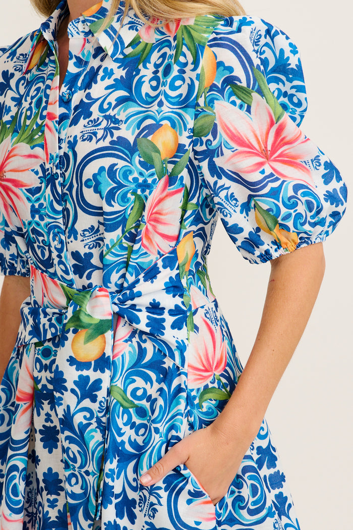 Belle Maxi Shirt Dress in Blue Multi Tiles Print Linen Blend