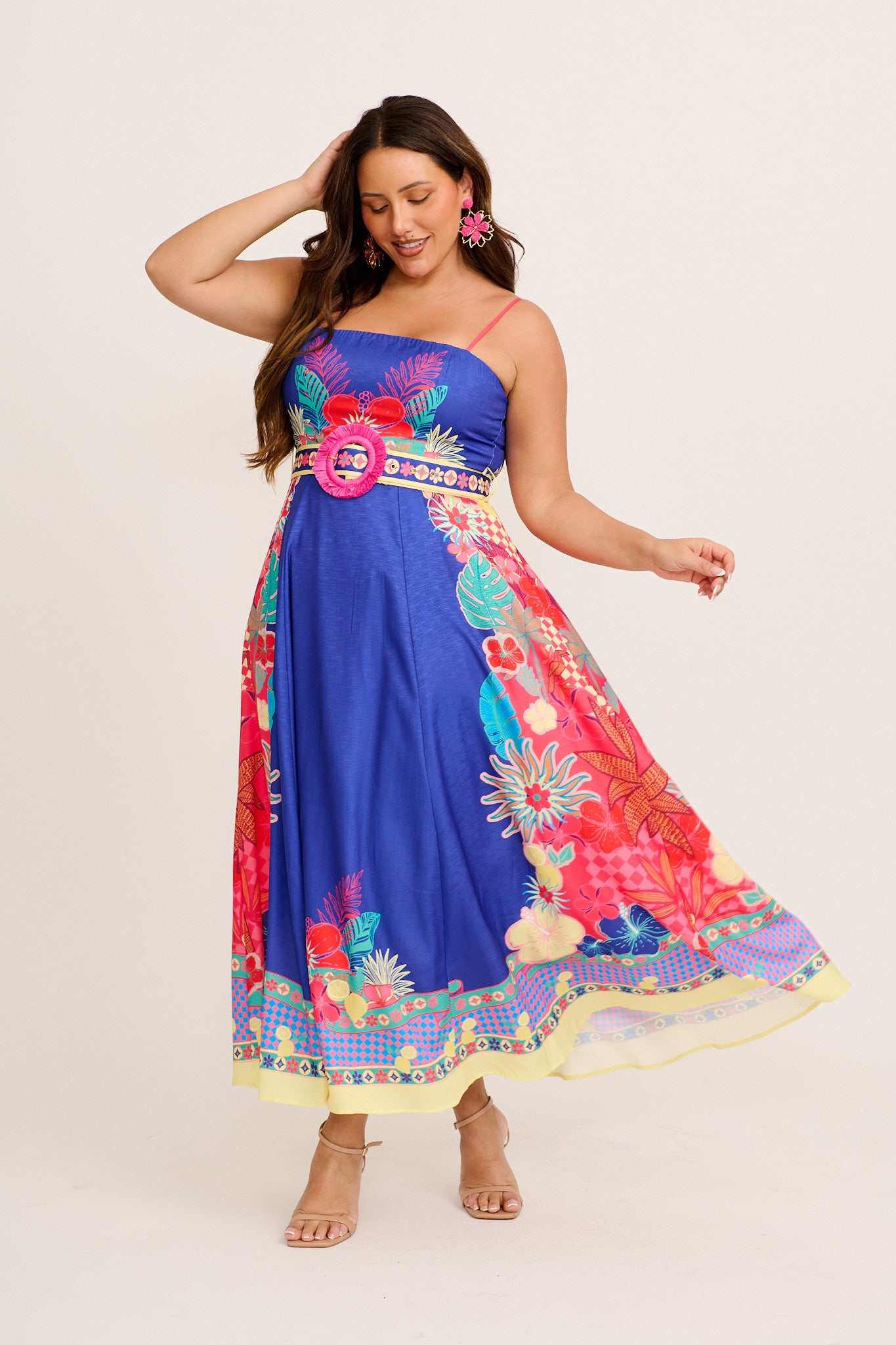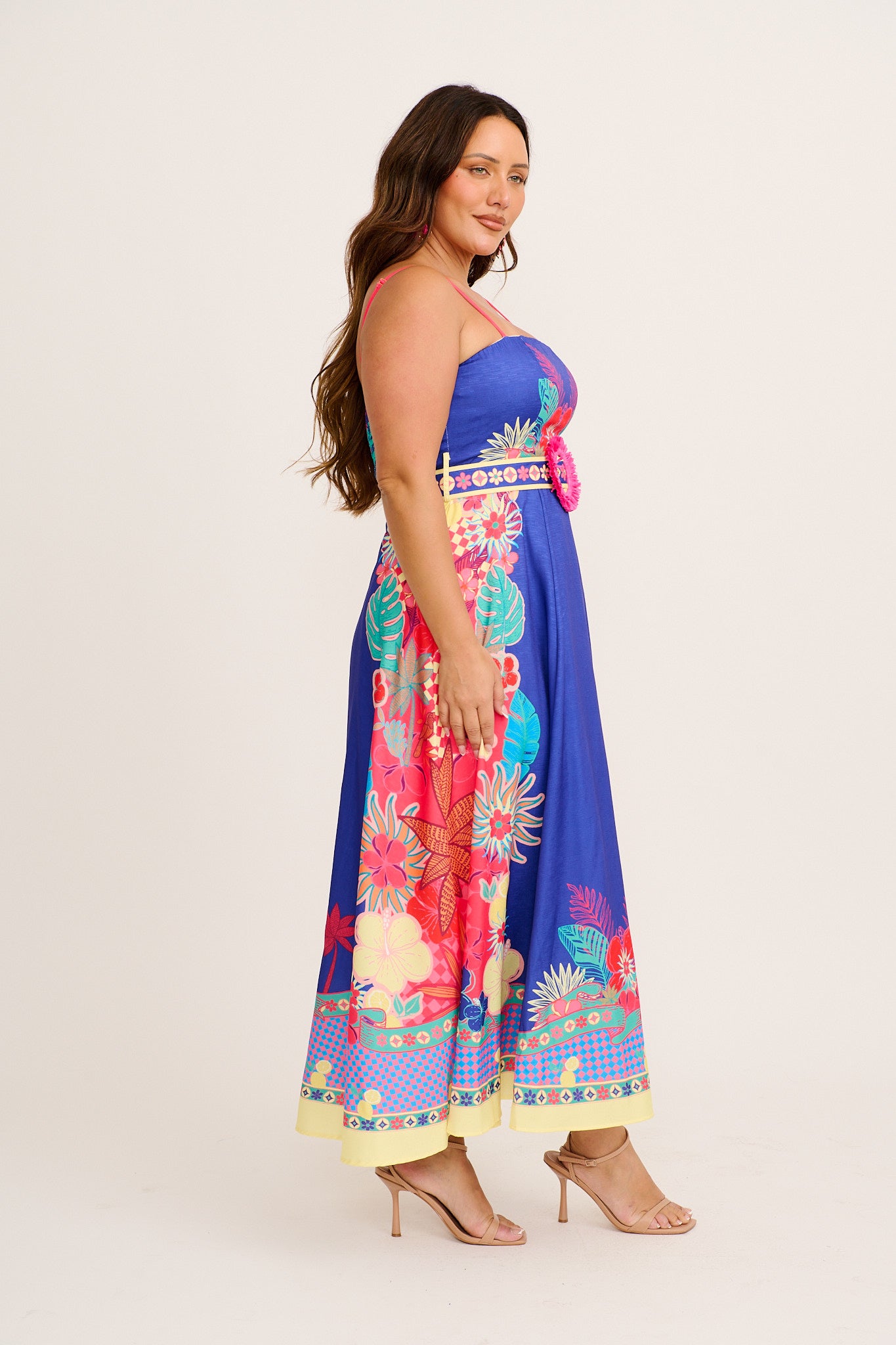 The Daylight Dream Maxi Sundress in Blue with Multi Print Linen Blend brings bold prints to a romantic shape. Ideal for events or escapes, it pairs elegance with ease.