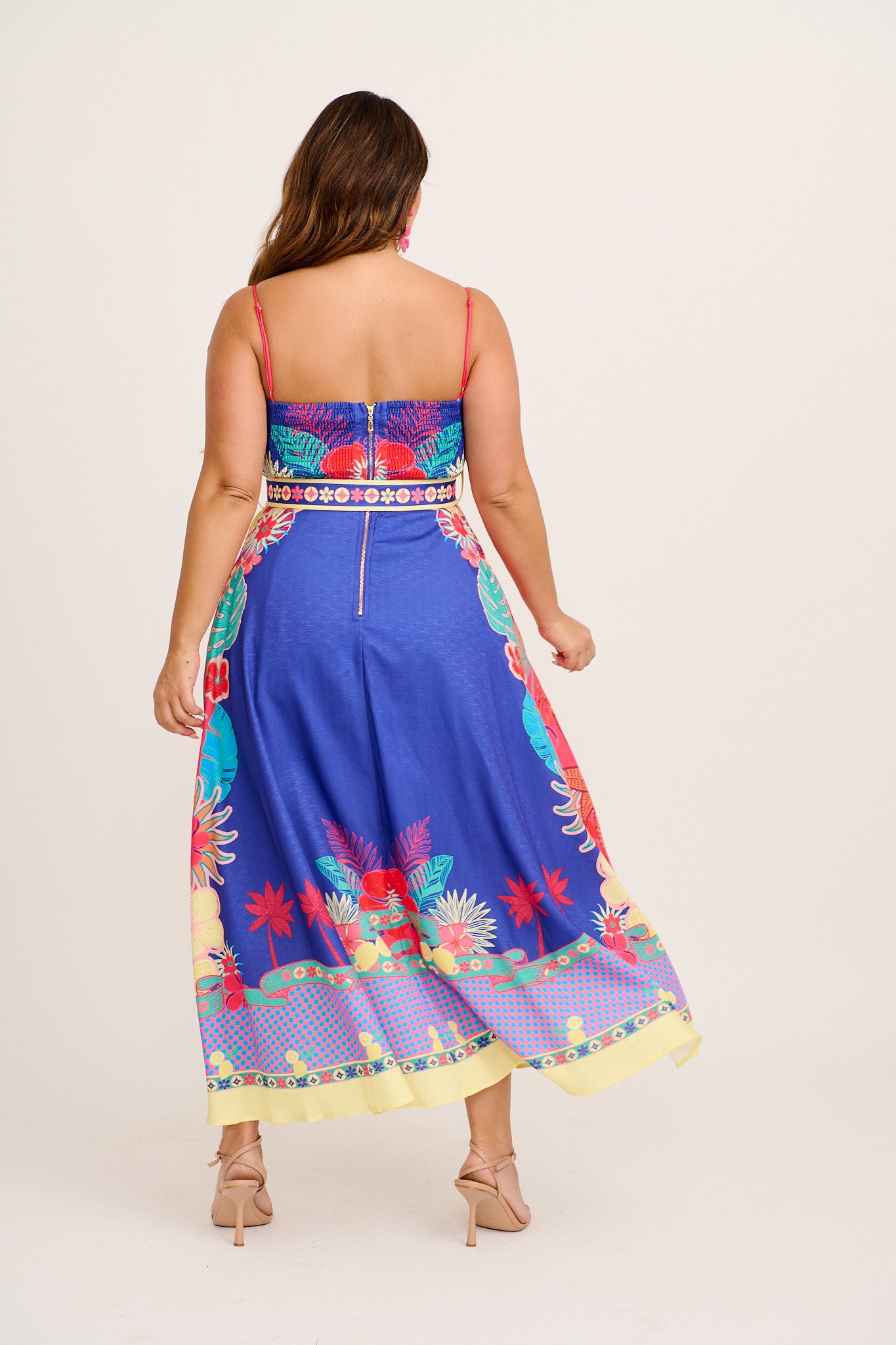 Designed with a shirred back and princess cut bodice, it offers a comfortable fit. Adjustable straps, a raffia-buckled belt and gold zipper elevate this summer standout.