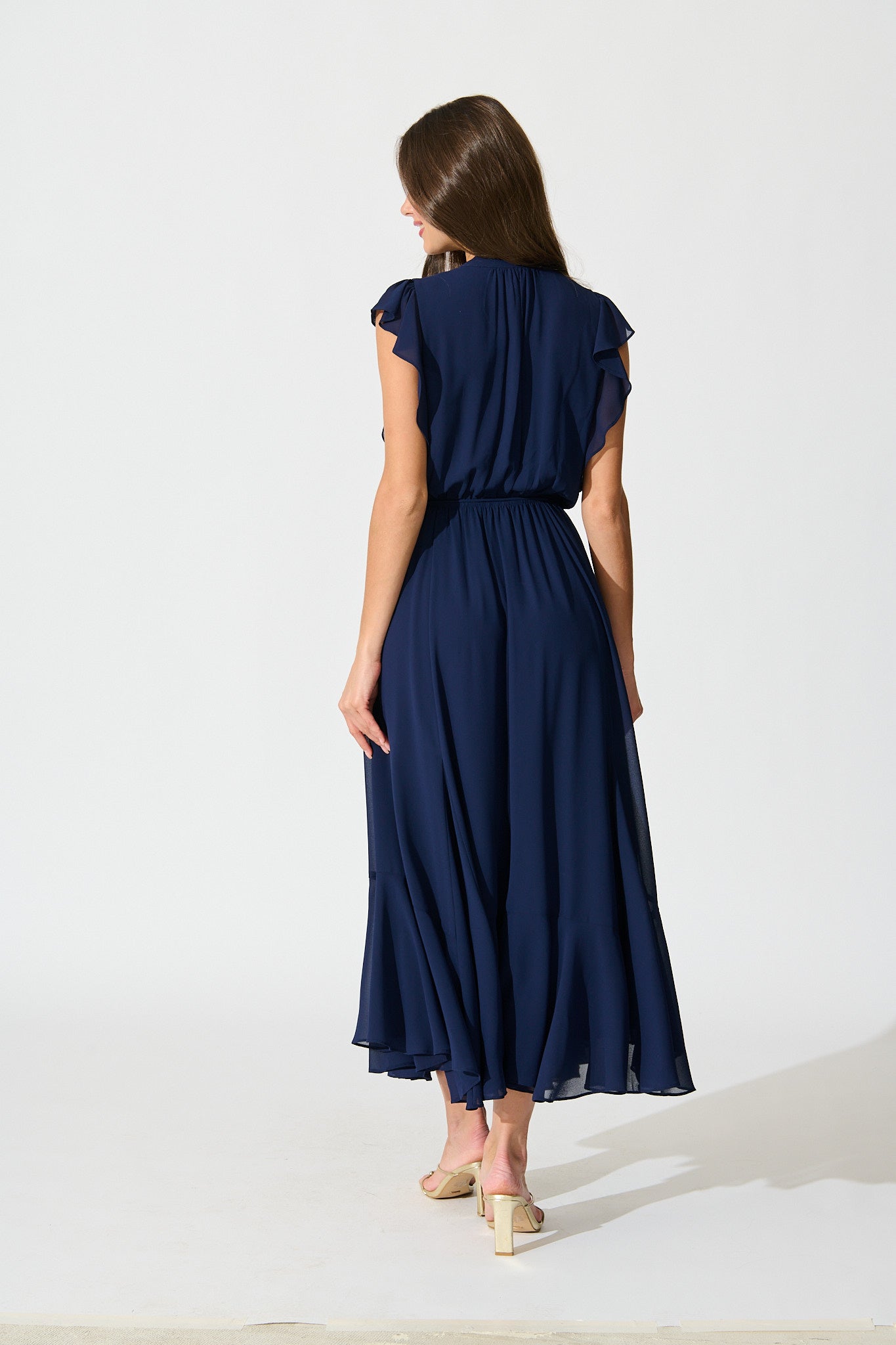 The Executive Ease Maxi Dress in Navy Chiffon brings a refined touch to every occasion, from the office to weddings and special dinners. With its flowing chiffon feel and elegant navy hue, this maxi is tailored for movement and comfort while maintaining a polished finish.