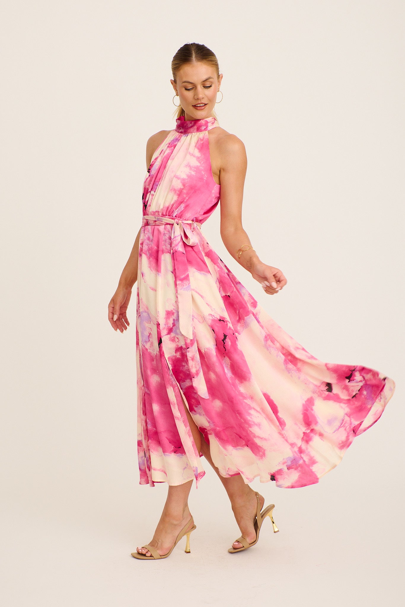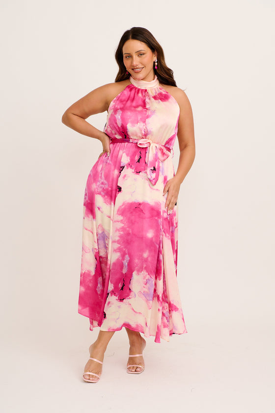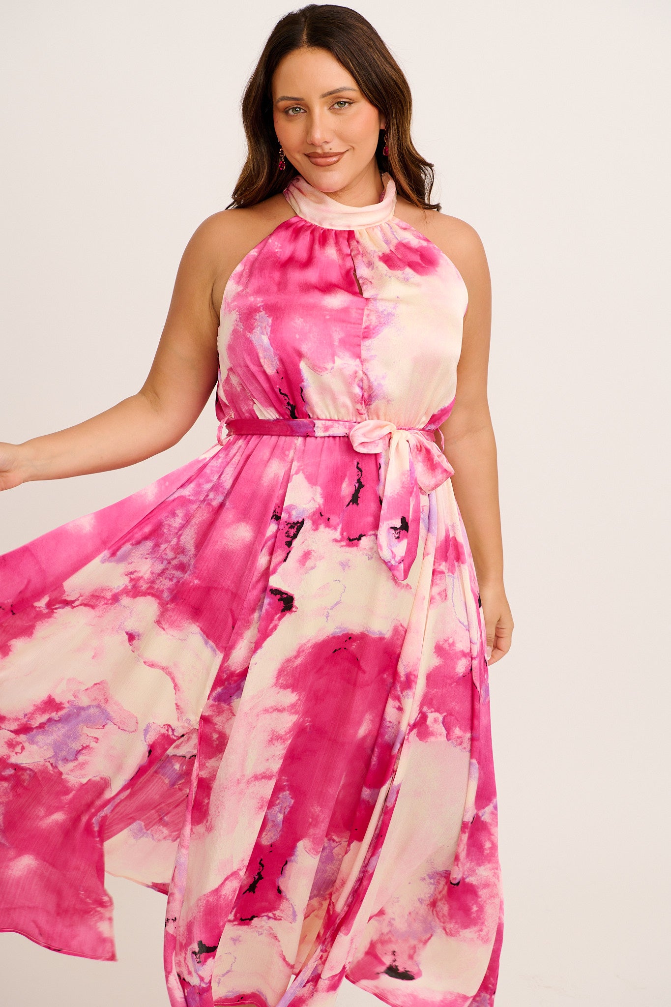 Kiss Me Halter Neck Maxi Dress in Magenta Watercolour Satin