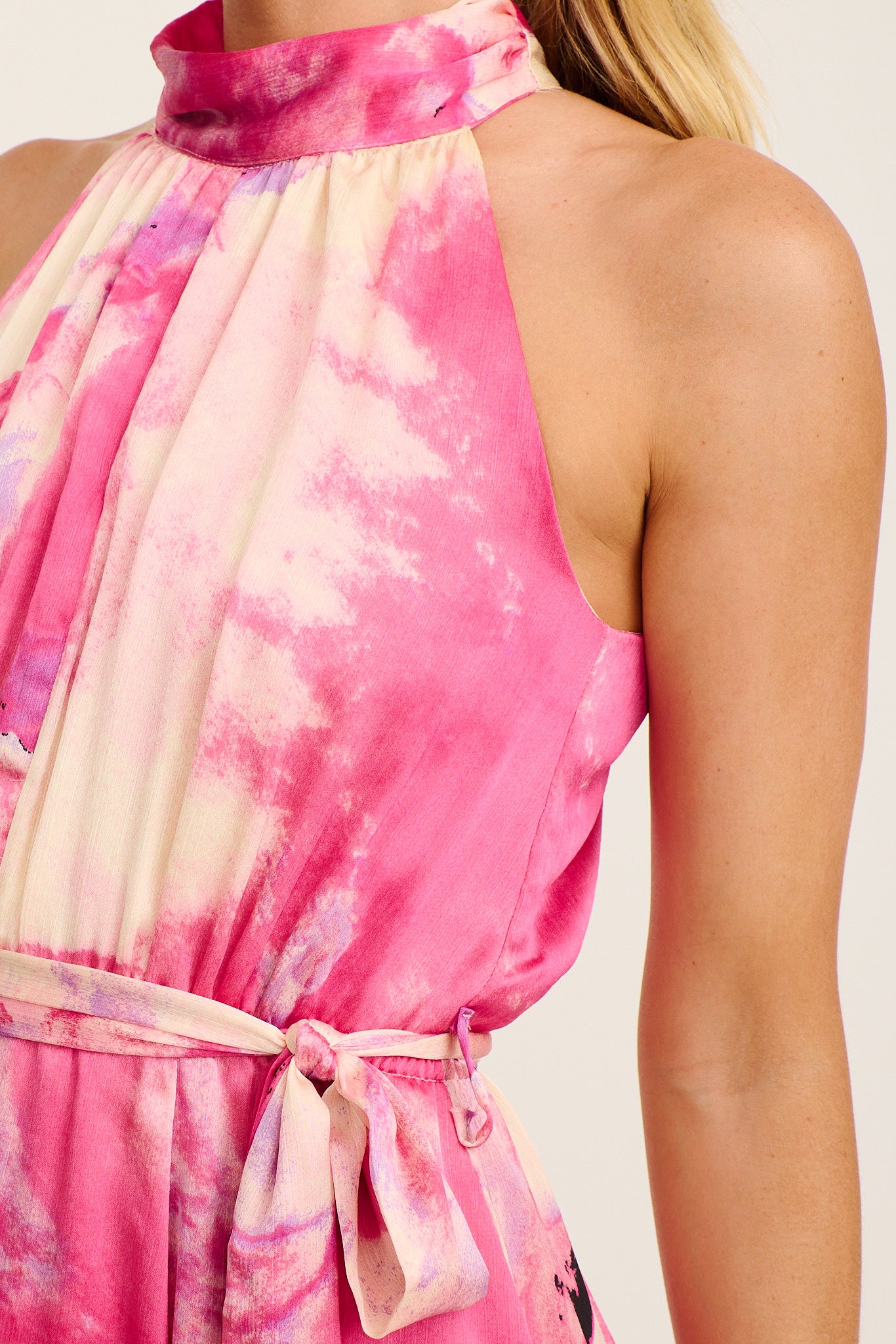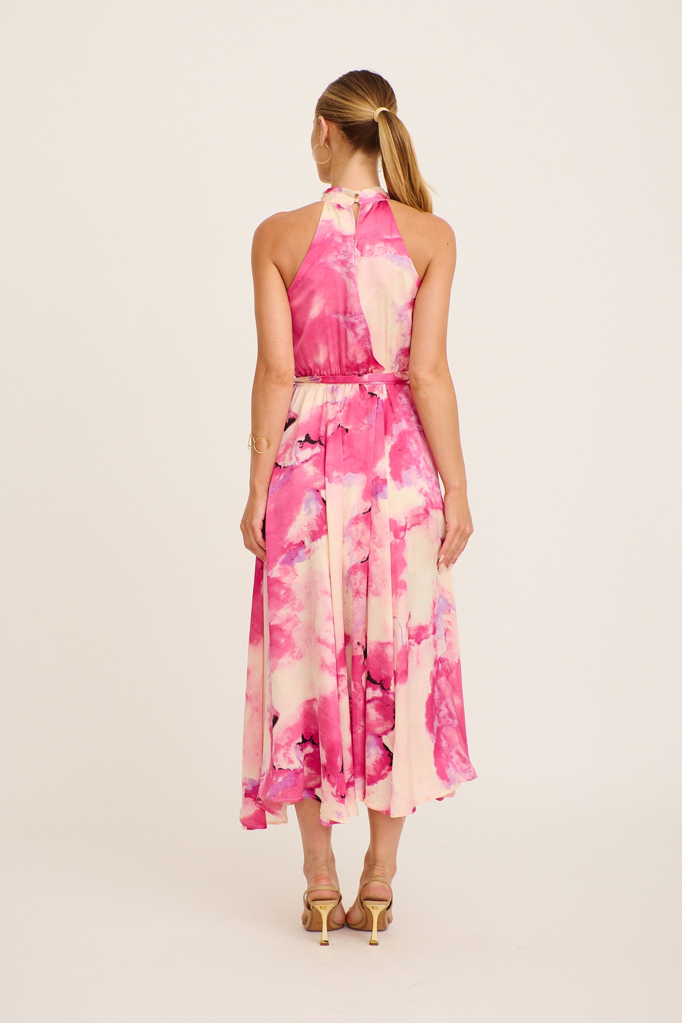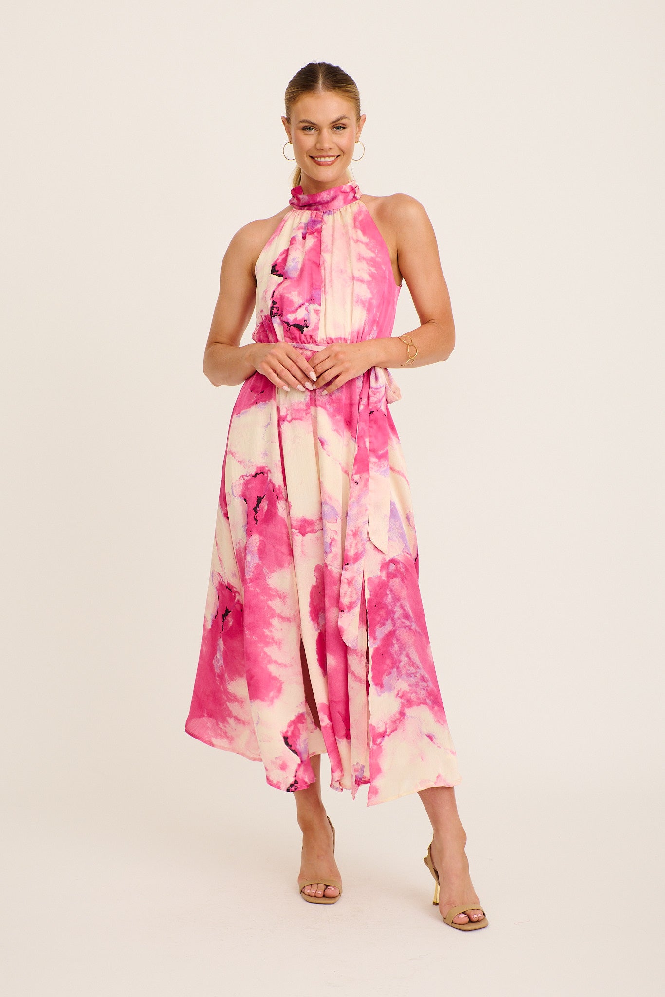 Kiss Me Halter Neck Maxi Dress in Magenta Watercolour Satin