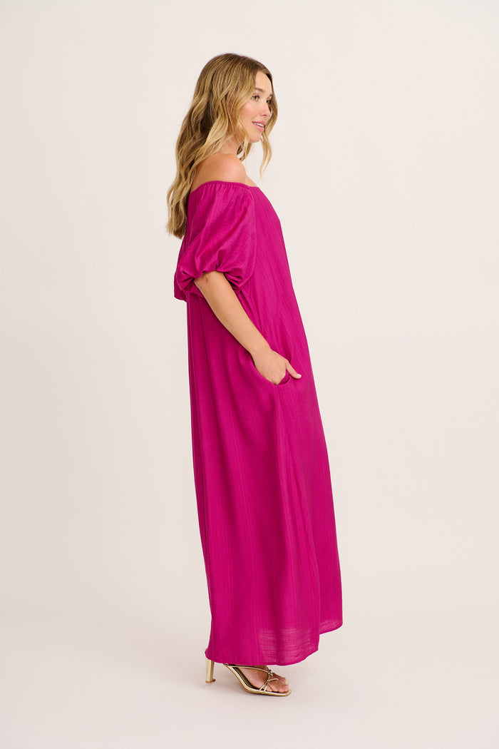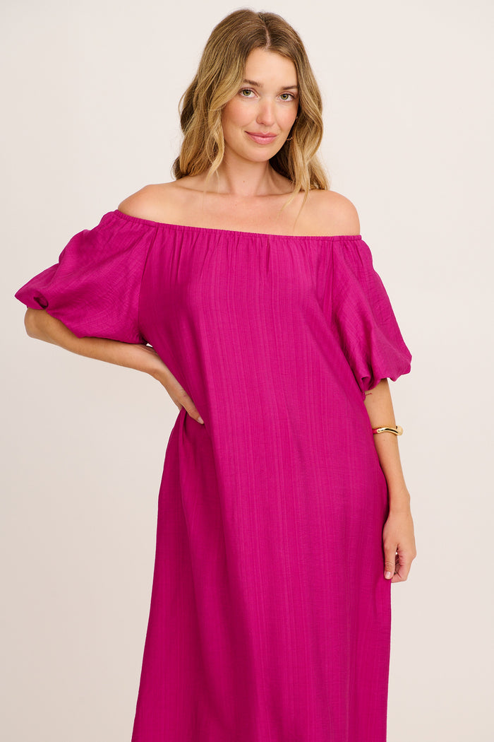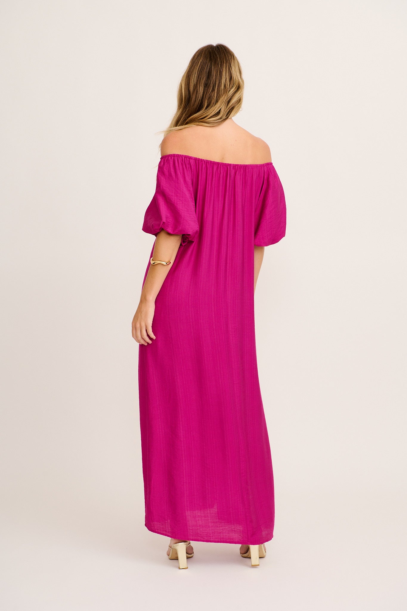 The off-the-shoulder neckline with encased elastic sits comfortably and securely, offering a flattering, shoulder-baring silhouette. Puff sleeves add volume and charm, while the relaxed shift cut skims the body in all the right places. The maxi length makes it feel effortlessly elegant — ideal for styling with sandals and a straw hat or dressing up with heels for a sunset soirée.