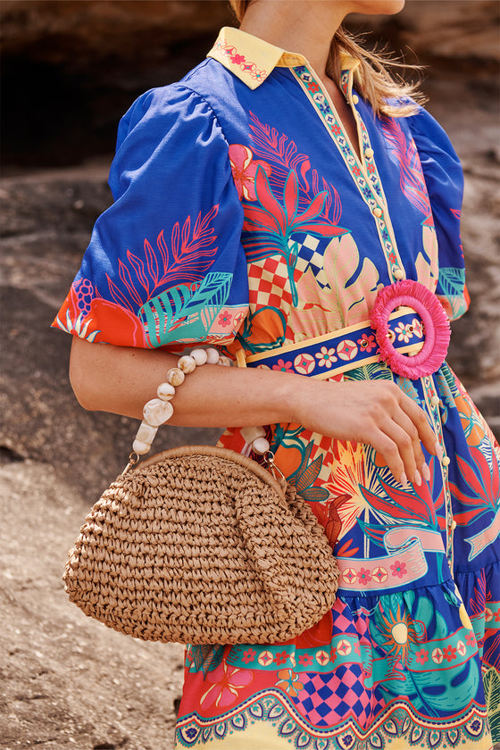 The Marina Beaded Handle Bag in Natural Raffia brings playful charm to your wardrobe. Its woven raffia body feels breezy and textured, while the removable acrylic bead handle adds a unique, eye-catching twist.