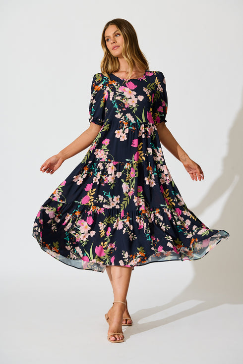 Nevi Tiered Midi Dress In Navy Multi Floral