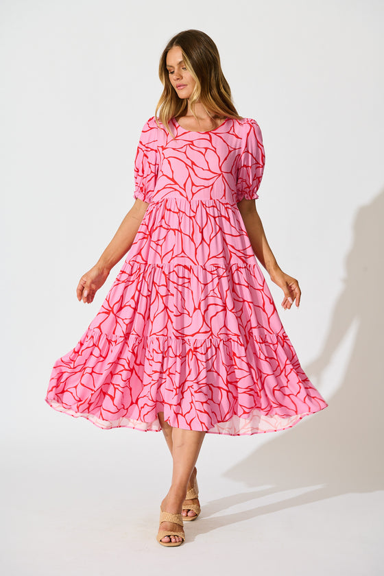 Nevi Tiered Midi Dress In Pink With Red Swirl Print