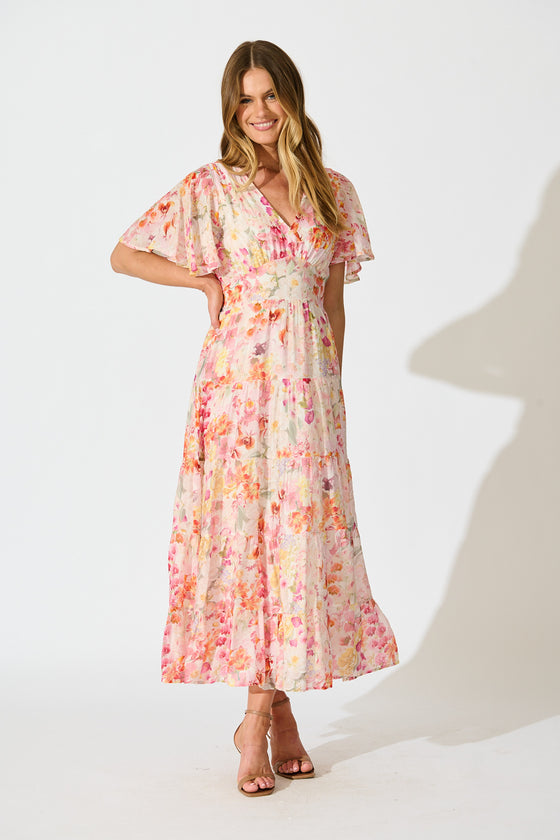 Pastel Symphony Maxi Dress in White with Multi Blush Floral