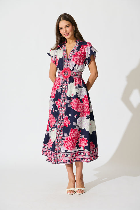 Portofino Bloom Midi Dress in Navy with Pink Floral