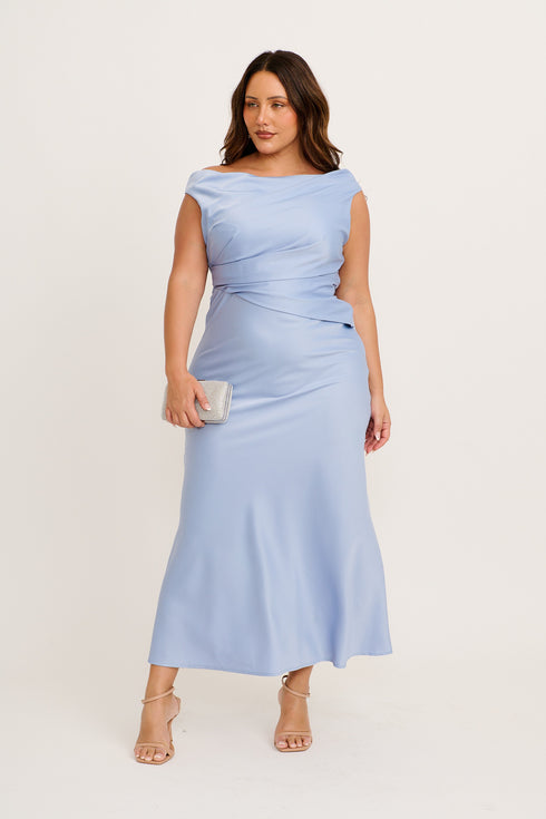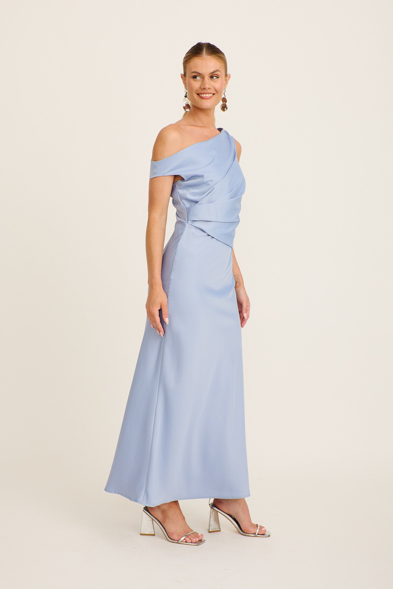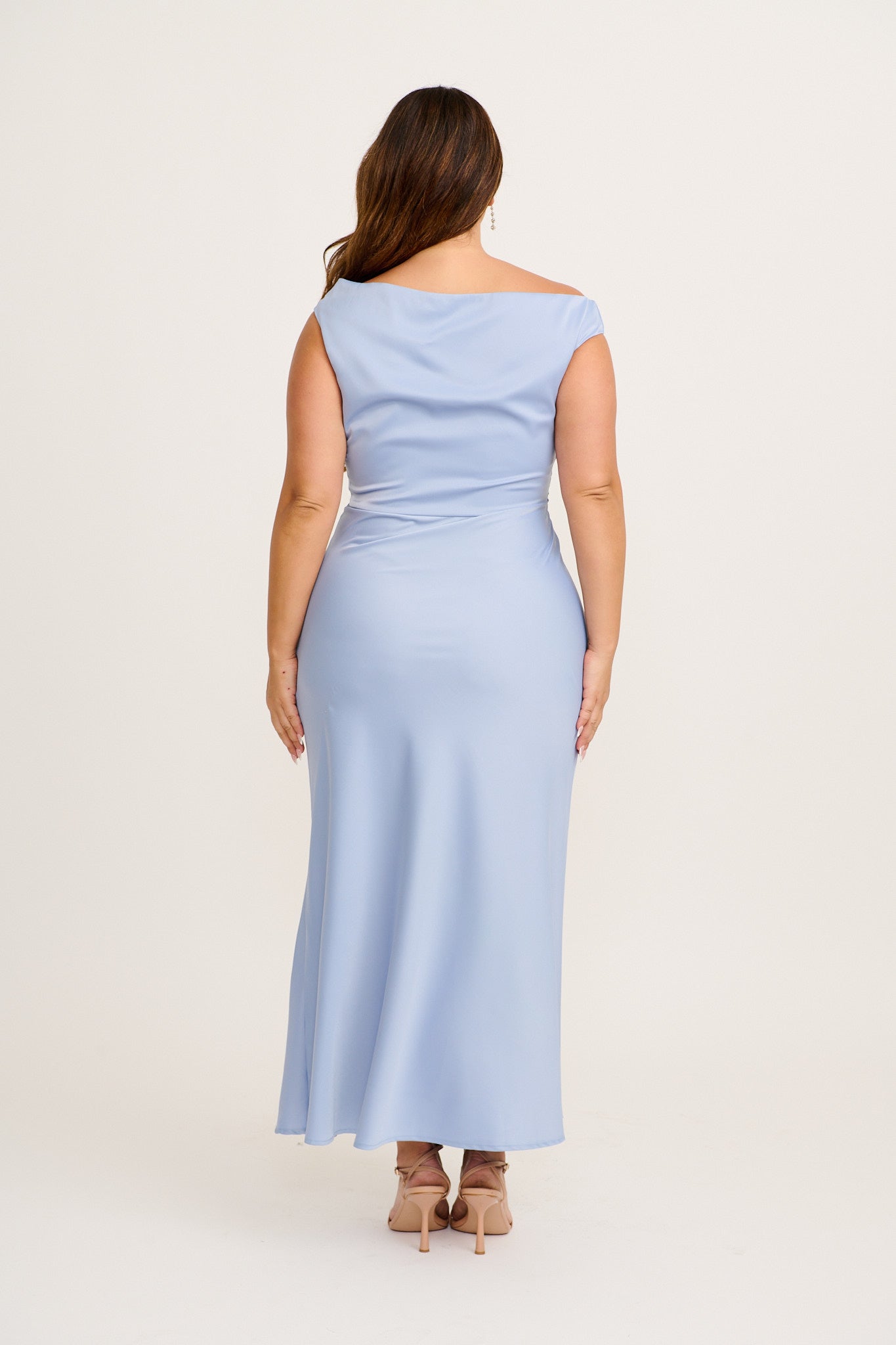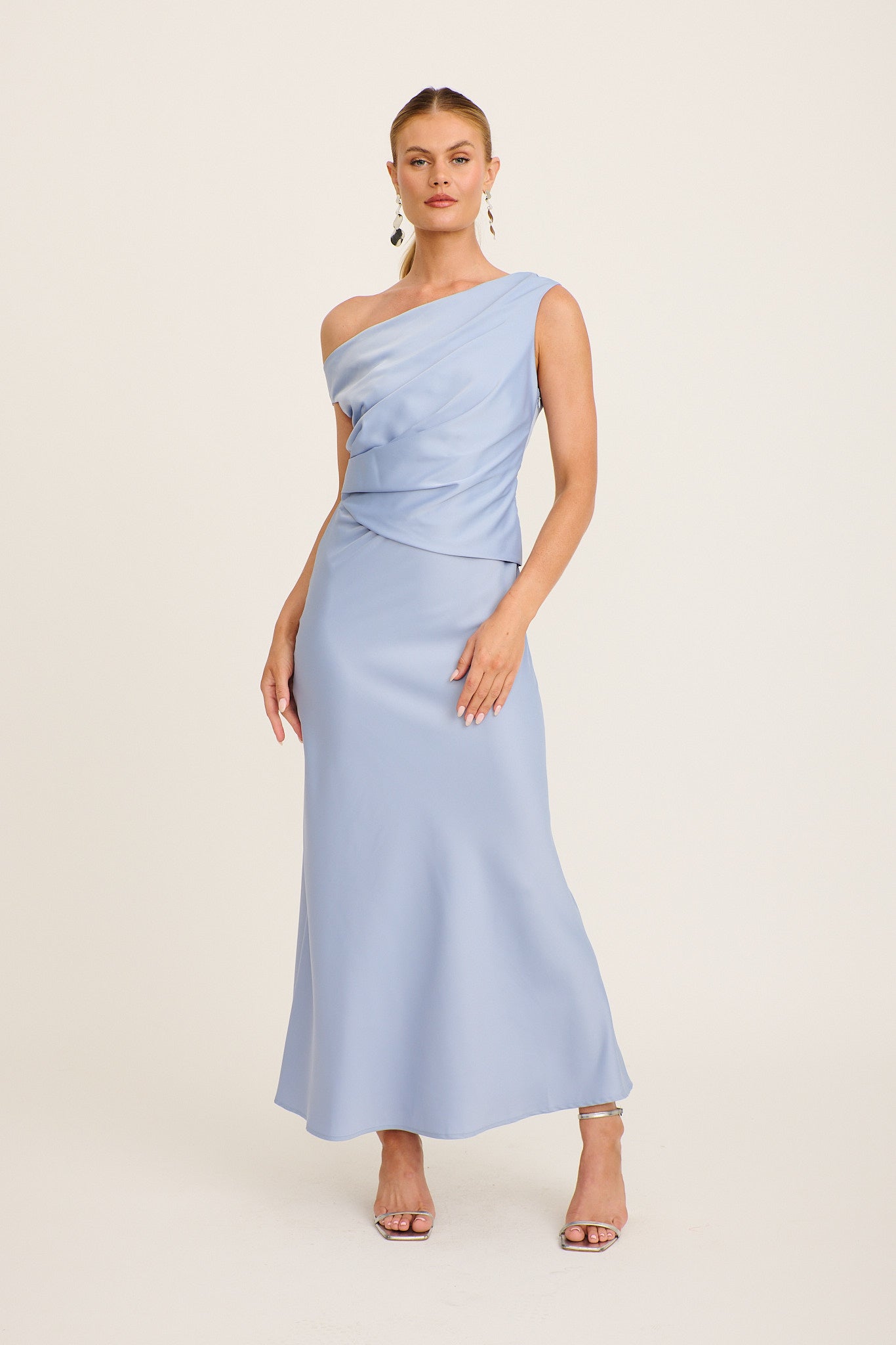 Rosé Nights One Shoulder Maxi Dress in Ice Blue Satin