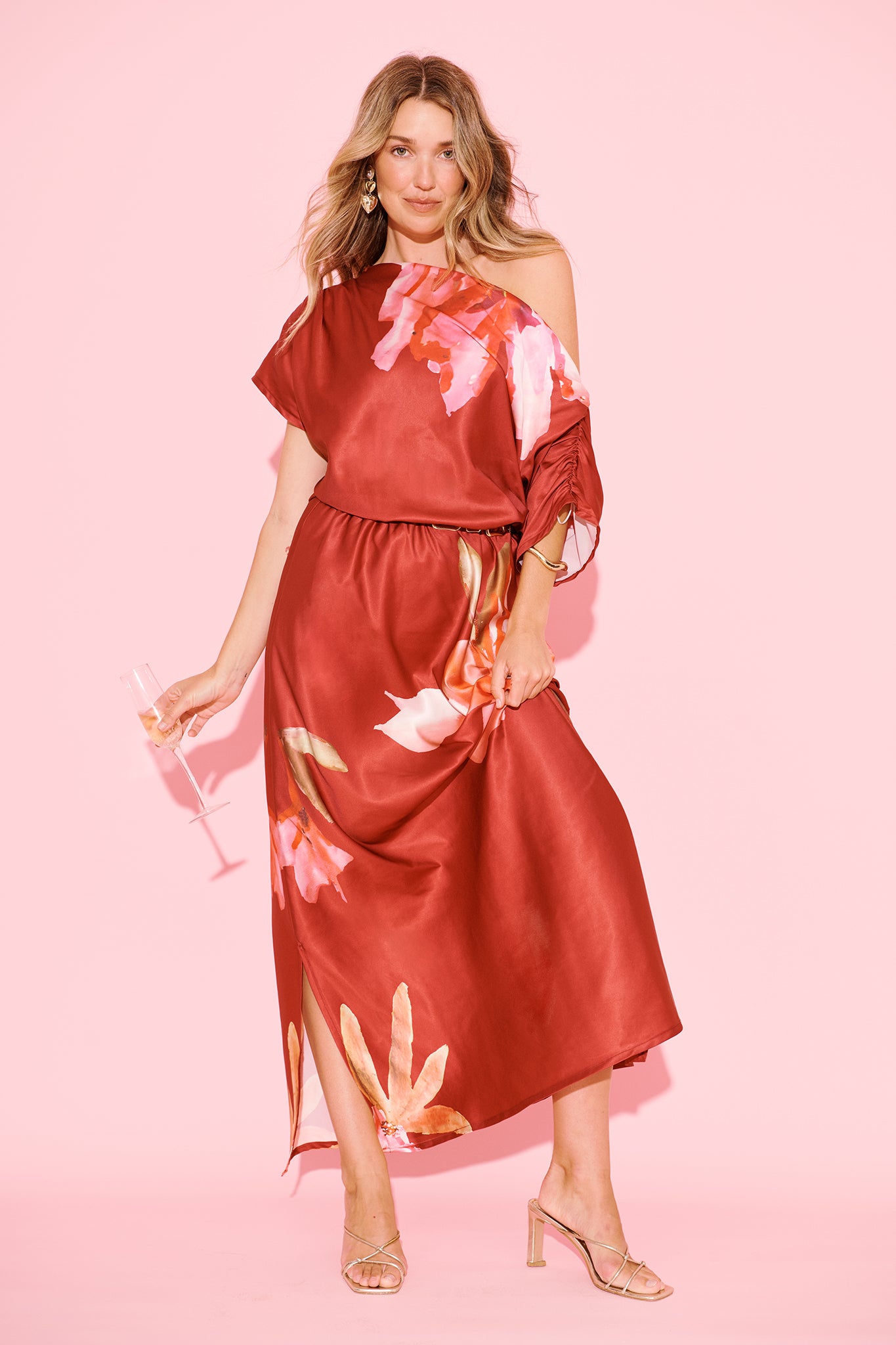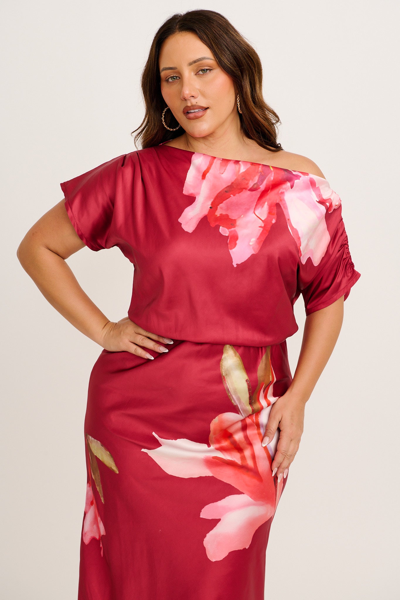 Sarita Maxi Off Shoulder Dress in Wine Floral Satin