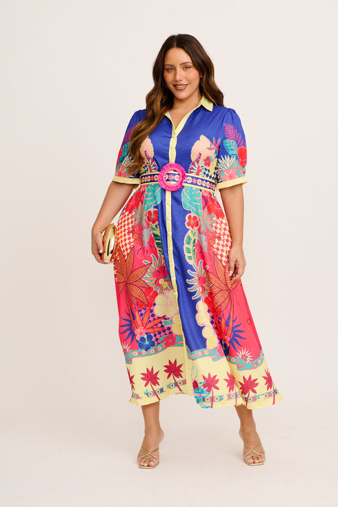 Sunbeam Maxi Shirt Dress in Blue with Multi Print Linen Blend