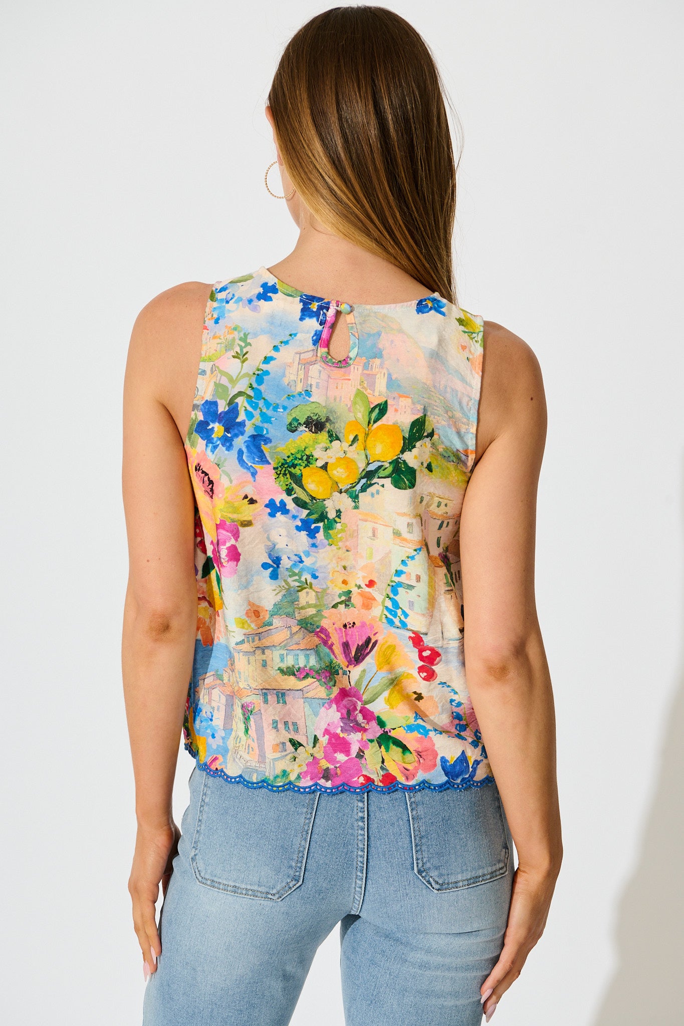 A centre-back keyhole with a self dome button and loop adds a subtle touch of detail. The scalloped navy trim at the hem offers an elevated finish that makes this top feel that little bit more special. Unlined for breathability and ease, it’s a throw-on style that will quickly become a go-to in your summer rotation. Each piece features a unique print placement for a one-of-a-kind look.