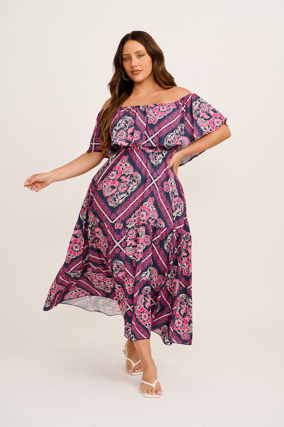 Tranquility Maxi Dress in Navy with Pink Floral Tiles Print
